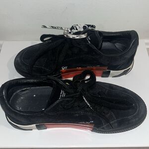 Off-White Vulc Low Black/Green, size “37”. These shoes are made of a soft black suede with classic Off-White styling throughout. Includes the iconic zip tie, and shoelaces. Lightly worn, these sneakers have plenty of life left in them. Size “37” equates to approximately woman’s size 6.5 or a men’s 5. Measures 10 inches from toe box to heel. Does NOT include original box.