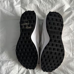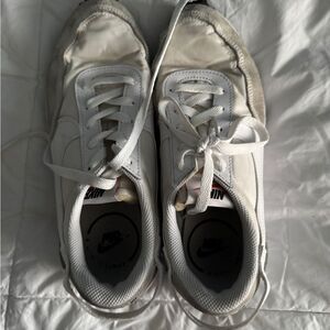 Classic Nike Daybreak sneakers in women’s size 8.5. Features a neutral white and beige colorway with suede overlays, mesh upper, and signature Nike swoosh branding on both sides and heel. Lightweight design with rubber waffle sole for everyday comfort and traction. Pre-owned with signs of wear (see photos), but still plenty of life left—perfect for casual outfits or streetwear looks.