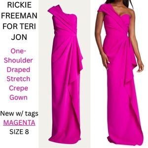 Rickie Freeman for Teri Jon asymmetric gown in draped stretch crepe.