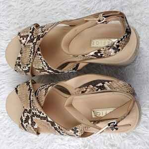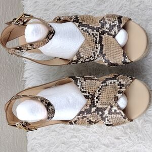 Office London Women's Brown/Tan Snakeskin Print Faux Leather Upper Open Almond Toe Six Hole Ankle Buckle Slingback Platform Espadrille Sandals. Man Made Sole. Minimal Sole/Heel Wear. Marks On Sole Per Pictures. Measurement approx. Heel: 4". Size 40/9.5US.
