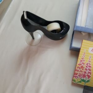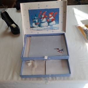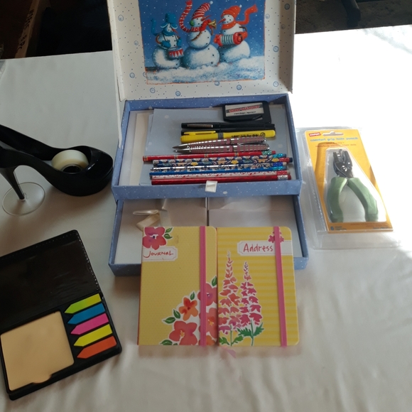 Items include a keep sake box with stationary and envelopes in the drawers (2). There is a small unused journal as well as an address book. Sticky tabs in a refillable container. High heel tape dispenser, new hole punch and 7 Christmas pencils, mechanical pen and pencil set and sharpies in great condition