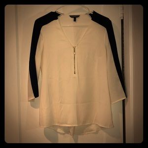 White polyester blouse with black stripe sleeve.