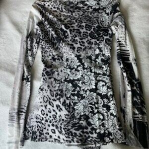 A top to go from office to evening. Great as is or with a Cami underneath. A black and white size L. Slimming pull on style.