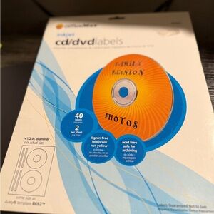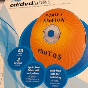 OfficeMax inkjet CD/DVD labels. Includes 14 labels per pack. Ideal for family reunion photos.