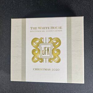 This is the official 2020 White House Historical Association Christmas Ornament honoring President John F Kennedy, the 35th President of the United States. The White House has been producing these ornaments since 1981. The 2020 ornament features an image based on President Kennedy's posthumous official White House portrait, which was painted in 1970. The back of the ornament includes the dates of Kennedy's presidency 1961 - 1963, and a quote from First Lady Jacqueline Kennedy. The ornaments are made in the USA by a veteran founded business. Made in USA from 24K Gold plated brass, the ornament supports the White House historical mission to educate the public about the White House. Comes in original box with booklet. In excellent condition. Non-smoking pet free home.