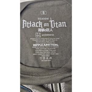 The Official Attack on Titan Survey Corp Season 2 Green T-shirt in size Small from Ripplejunction is a must-have for any fan of the popular TV show. This regular fit t-shirt is perfect for men who want to show off their love for the show through stylish and comfortable clothing. The green color adds a unique touch to the design, making it stand out from other t-shirts. Embrace the world of Attack on Titan with this officially licensed shirt.