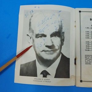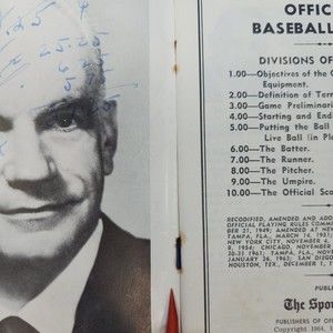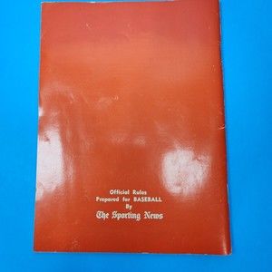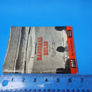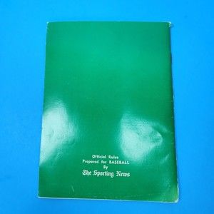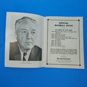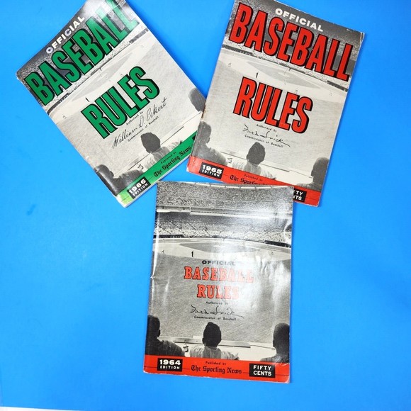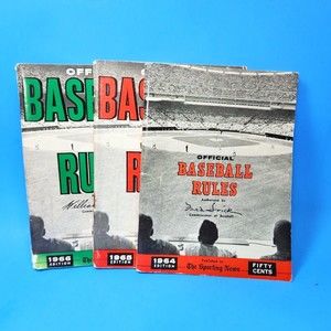 1964,1965, 1966 Official Baseball Rules Booklets published by The Sporting News Each measures about 6.5 in long by just shy of 5 in wide These were authorized by the Baseball Commissioner of the time Each is 88 pages staple spine bound Condition: Show shelf wear, age Volume 1965 rusty staples pulled away from cover. 1966 Volume has more wear on spine, tiny ink on front cover & Commissioner has ink numbers on face, stain bottom of page & Rust on staples.