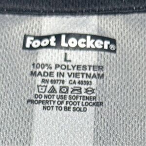 The Official Foot Locker Genuine Referee Stripes Employee Uniform Shirt in size Large features a V-neck design and comes in black color. This shirt is specifically designed for male employees of Foot Locker and follows a standard uniform style. Perfect for those looking to represent the Foot Locker brand in a professional and stylish manner.