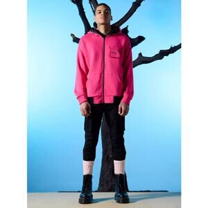 Step into the world of Squid Game with this bold and iconic pink hoodie, inspired by the guards in the global hit Netflix series. This full-zip unisex hoodie features a vibrant hot pink color, front pouch pockets, and a chest flap pocket embroidered with the Squid Game logo. The included detachable black mesh hood with white triangle print replicates the look of the show's guards, making it perfect for cosplay, themed parties, Halloween, or everyday streetwear with an edge.