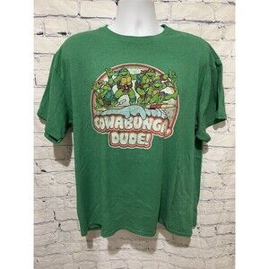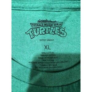 This Official Nikelodeon Teenage Mutant Ninja Turtles T-Shirt in Men's Size XL features a solid green color with a crew neck and short sleeves. Made from a blend of polyester and cotton, this vintage shirt showcases the iconic Teenage Mutant Ninja Turtles character family in a retro cartoon theme. The regular fit T-shirt is perfect for fans of the classic animated series and is a stylish addition to any man's wardrobe. 24 inches pit to pit and 29 inches long. Smoke free home.