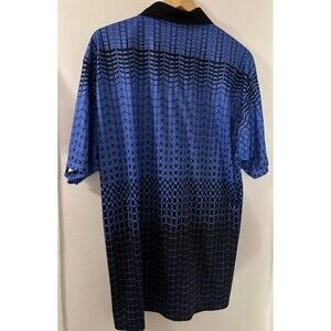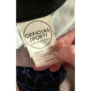 The Official Sports International Nisoa Soccer Referee shirt in blue and black is a men's size large jersey designed for activewear. Made of 100% polyester fabric, the shirt features a collared neckline, button closure, and short sleeves. It is machine washable and includes pockets for convenience. The shirt is part of the Official Sports International NISOA product line, perfect for soccer referees during any season. The geometric pattern and dark fabric wash add a stylish touch to this athletic fit shirt. Length 33 Arm to armpits 21 Sleeves 11. Great Soccer shirt. Thank you for looking!