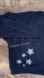 Navy knit cardigan featuring 5 star patches sewn on wearer's front left chest with 5 star patches sewn on wearer's front right hip and "Taylor Swift Midnights" patch sewn on wearer's front left hem with 5 star patches sewn on wearer's back left shoulder and 5 star patches sewn on wearer's back right hip.