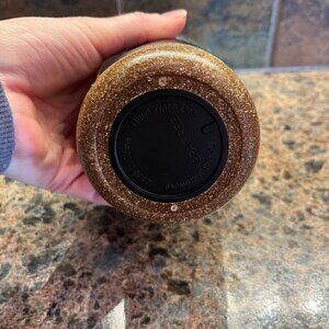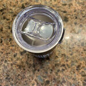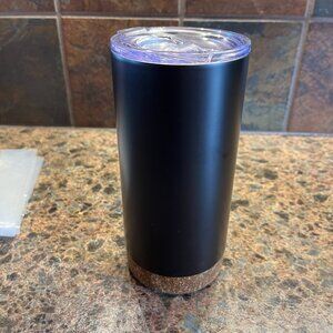 *Double wall logo travel mug with lid that is approximately 7” tall and 3.25” in diameter