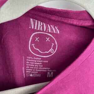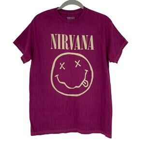 Officially Licensed Nirvana Nevermind Smiley Grunge Tee Magenta Acid Wash Medium