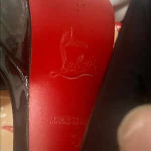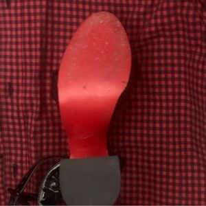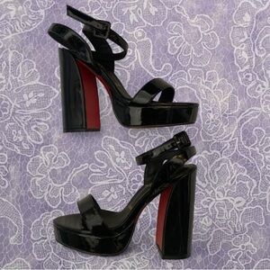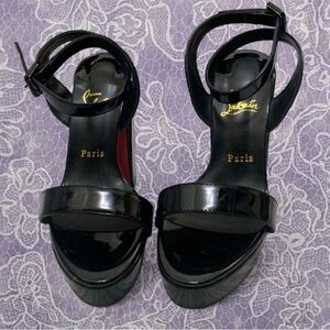 Leave me speechless! Shiny black patent leather Lou Boutin platform sandals with red accents on the heel on the inside. Heel is 4.5 inches of oh la la. Says 37 I would say it’s a 7 and not a 6.5. #glamour #heels #louboutin #fabulous good/like new no signs of wear gently worn less than a handful of times