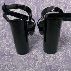 Sleek black patent platform sandals with a secure ankle strap. Bold red accents on the inner heel add a striking contrast. Comfortable block heel for stable, all-day wear. Elegant design that pairs well with evening and dressy looks.