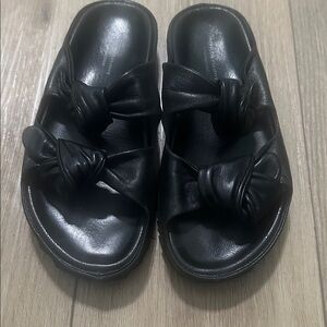 Officine Creative Pelagie 021 black leather slide sandals. Minimalist knotted strap design with the brand’s signature serrated sole.