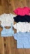 Set of six crop tops in various colors. Includes pink, blue, navy, and cream|white shades. Perfect for casual wear. Great to almost new like conditions but have been worn and washed.