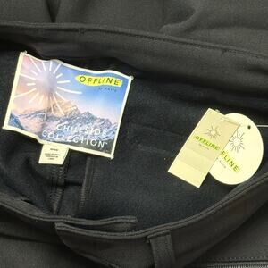 • Other information: Get ready for the winter season with these stylish Offline By Aerie Pants. Designed for women, these snow pants come in size medium and features a button closure with slash pockets. The fabric type is a combination of polyester and spandex, making it water-resistant and machine washable. These black pants are perfect for any winter sports enthusiast, whether you're skiing or sledding. The straight leg style with a mild compression area around the abdomen provides a comfortable fit for all-day wear. The Aerie Chillside Collection is known for its high-quality products and these pants are no exception. Add them to your activewear or casual wardrobe today!