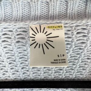 Keywords: blue sweater, pullover, V-neck, open-knit, ribbed cuffs, casual wear, fall fashion, women's sweater, machine washable, cotton blend, long sleeve, Offline by Aerie, pre-owned, comfortable, stylish.