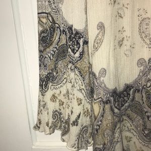 Flowy, off the shoulder cream blouse with tan/purple unique pattern