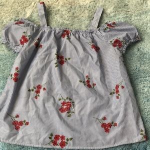 This top has straps and it’s off the shoulder. It has been worn exactly one time. It has a striped and flower pattern