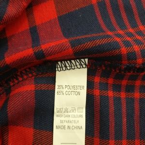 Off-the-shoulder plaid blouse with faux buttons down the front.