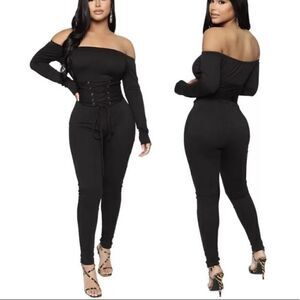 Fall look!!! Off the Shoulder Jumpsuit with belt band that crosses. Fitted and comfortable. Add Jacket wear these with sneakers or your heels and be stylish