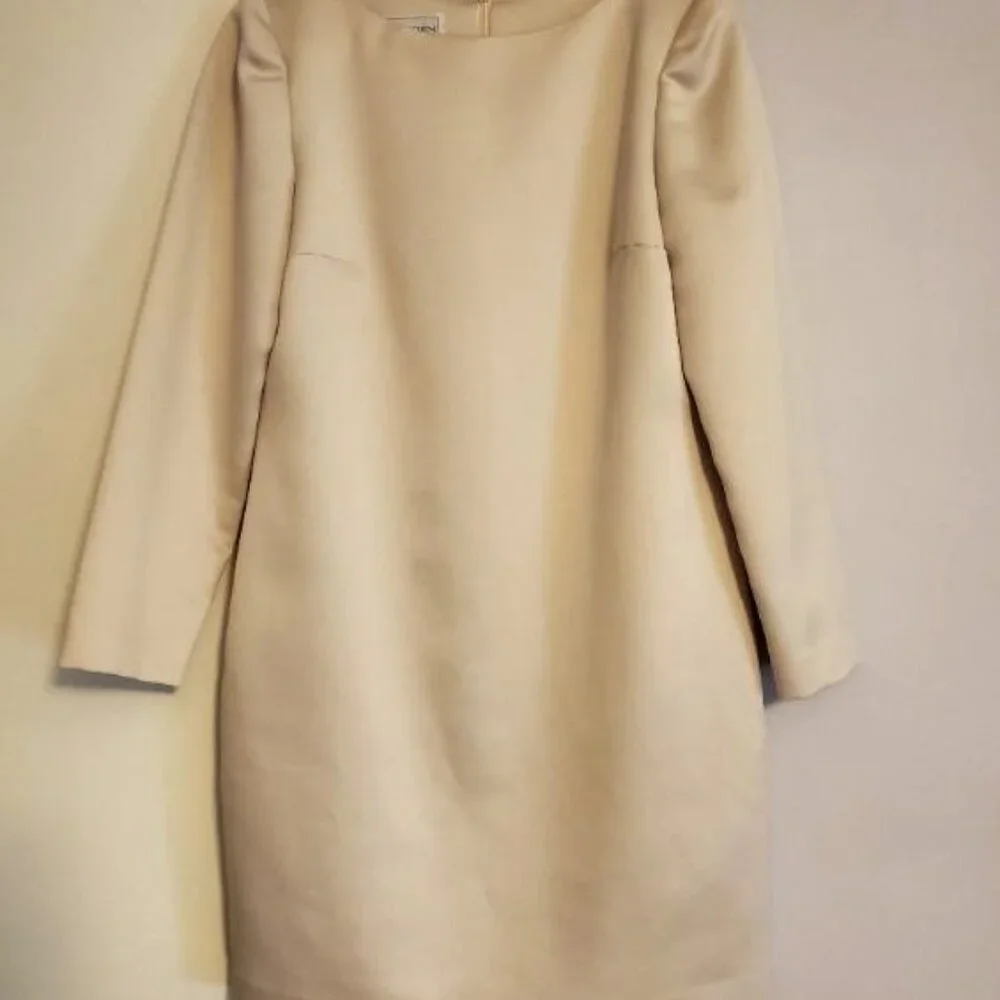 This off-white sheath with long sleeves hits right above the knee. It has a long back zipper and back pleat. The material is polyester, but it looks like satin.