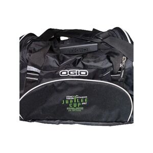 The Ogio Travel Duffel Sports Gym Bag is a large, black nylon bag designed for travel, casual wear, workwear, and business occasions. It features a solid pattern with zippers for closure and a shoulder strap handle style. Also includes custom embroidery of prestigious golf course. The bag is suitable for men or women and showcases a theme of travel, school, overnight bags, coaching, gym, and sports. It includes outer pockets, an adjustable strap, and various pockets for organization. Perfect for carrying golf or baseball gear, this duffel is a versatile and stylish accessory.