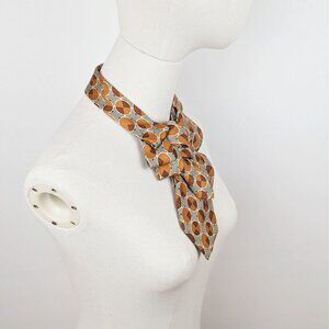 As much as a fashion statement as a practical accessory, this soft and comfortable ascot scarf will set you apart from every one else! Made from an upcycled necktie, in a buttery cream , with terracotta circles. Wear it with a dress or suit to the office, or out to dinner with friends. The possibilities are endless! One of a kind re-purposed necktie scarf. - Made from a recycled men's silk tie - Meticulously pleated and hand stitched - Front magnetic snap closure - Measures 21" snap to snap - Dry clean only Please, don't hesitate to contact me with any questions. ~ Christine.