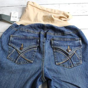 These denim blue jeans have a secret belly panel that can be worn under the belly, mid belly or over the belly. They are brand new with tags.