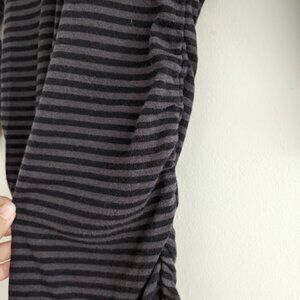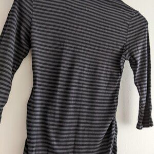 Oh Baby by Motherhood 3/4 sleeved shirt. The shirt has black and grey horizontal stripes. It has a v neckline. There is ruching along the sides of the shirt for additional stretching. Size small