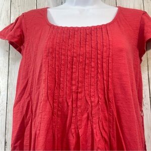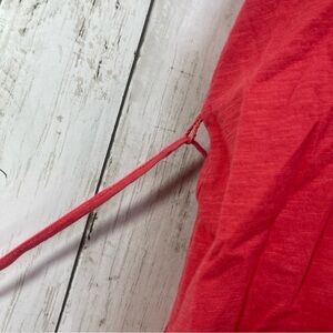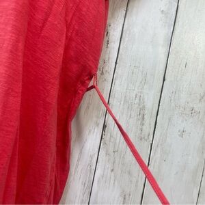 Reddish orange, pleated upper front, removable string tie, cap sleeves, missing material and care tag, believe to be a cotton blend, colors may vary due to lighting, good used condition, medium