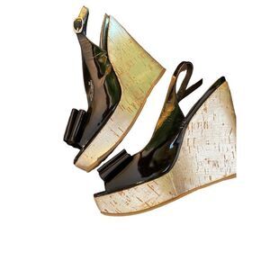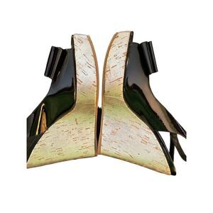 Textured metallic sole with black patent leather uppers and patent leather bow across the toe.