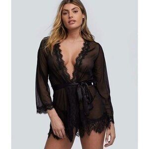 Oh La La Cheri Black Eyelash Lace Robe Set Belted Tie Lingerie