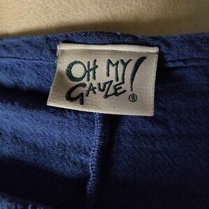 A full figure cotton gauze top with two front pockets and front and back points at the hemline.
