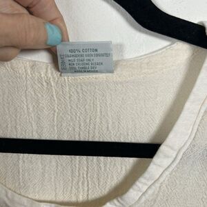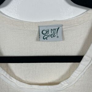 Elevate your style with this beautiful Oh My Gauze tunic top, perfect for any occasion. The cream-colored blouse features a round neckline, short sleeves, and a pullover closure. The top is made of 100% cotton woven fabric, giving it a comfortable and stylish texture.