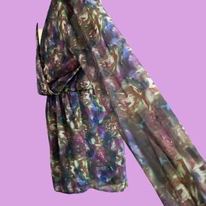 Beautiful romper with sheer, long sleeves. Complete elastic waistband and 4” inseam shorts. The entire garment is lined (minus the sleeves). No negative issues to disclose. Outstanding condition.