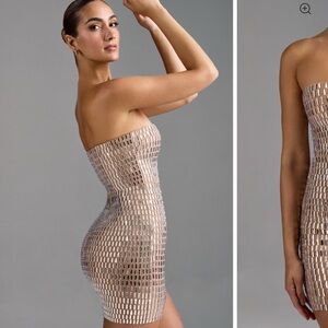 This elegant strapless dress features a chic beige design, perfect for any occasion. Its sleek silhouette offers a sophisticated look.