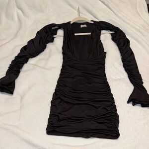 Chic black dress with long sleeves. Deep V-neckline. Ruched detailing for a stylish look.