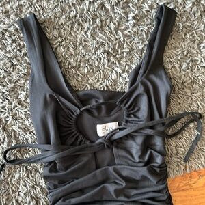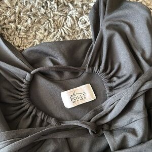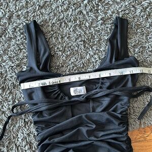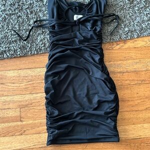 Sleek black mini dress. Ruched design. Sleeveless with tie detail.