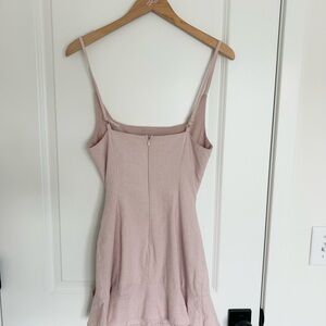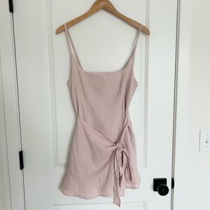 Chic mini dress with a wrap design. Features a soft blush pink hue. Perfect for any occasion.