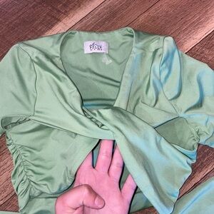 Oh Polly Cross Over Bell Sleeve Flirty Cut Cropped Long Sleeve Stretchy Top UUU