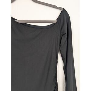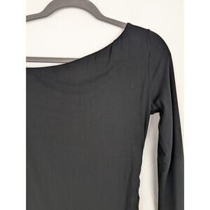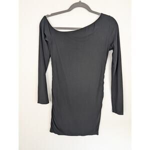 Features and description: Fia Dress; long sleeves; asymmetrical off shoulder; ruched; modal blend; black