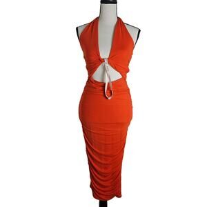 Oh Polly Halter Cutout Ruched Midi Dress Women's Sz 4 Orange Bodycon Party