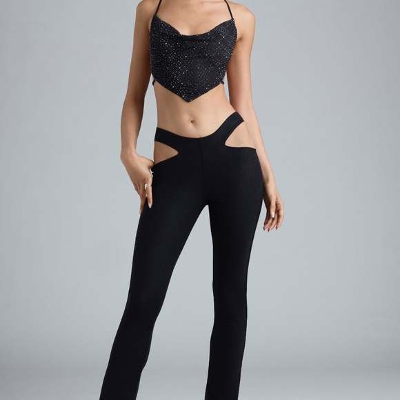 Oh Polly Metallic Cut-Out Low-Rise Flared Trousers in Black 4