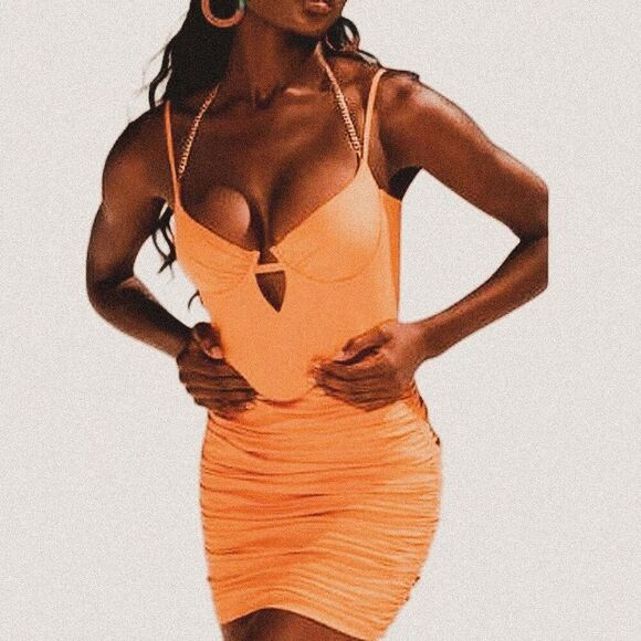 Turn heads in this Oh Polly corset mini dress—vibrant orange with gold chain accent strap for major statement energy. 🔥