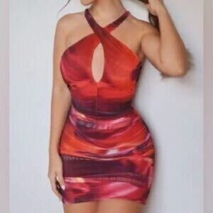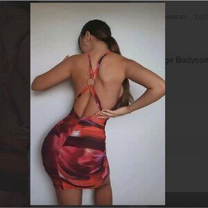 Oh Polly Out Mini Dress Of This World Galaxy Red Orange Ombré Ruched Bodycon US Size 4 Brand NEW with Tags