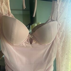 Elegant Oh Polly pink ruched dress with sheer, beaded sleeves. Perfect for special occasions. Brand new with tags.